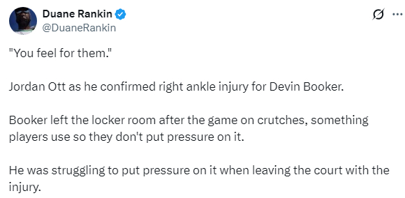 赛后太阳主帅乔丹-奥特表示,真为他们感到难过;据太阳记者报道,布克拄着拐杖离开球馆,以此避免给受伤的脚踝更大的压力。