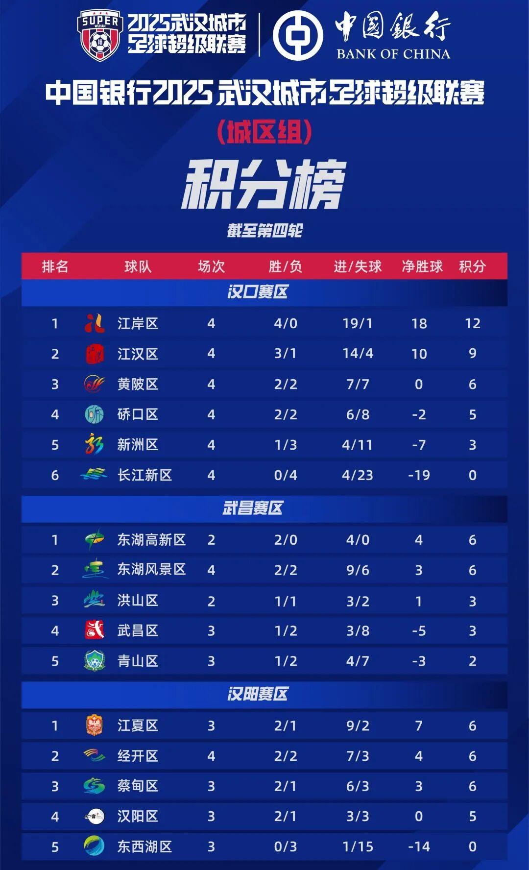 【越乔】获悉,截至第四轮, 2025武汉城市足球超级联赛积分榜出炉,排名有新变化。 其中,江岸区总积分12位居第一,其次是9分的江汉区,而长江新区和东西湖区积分仍为0,加油!...