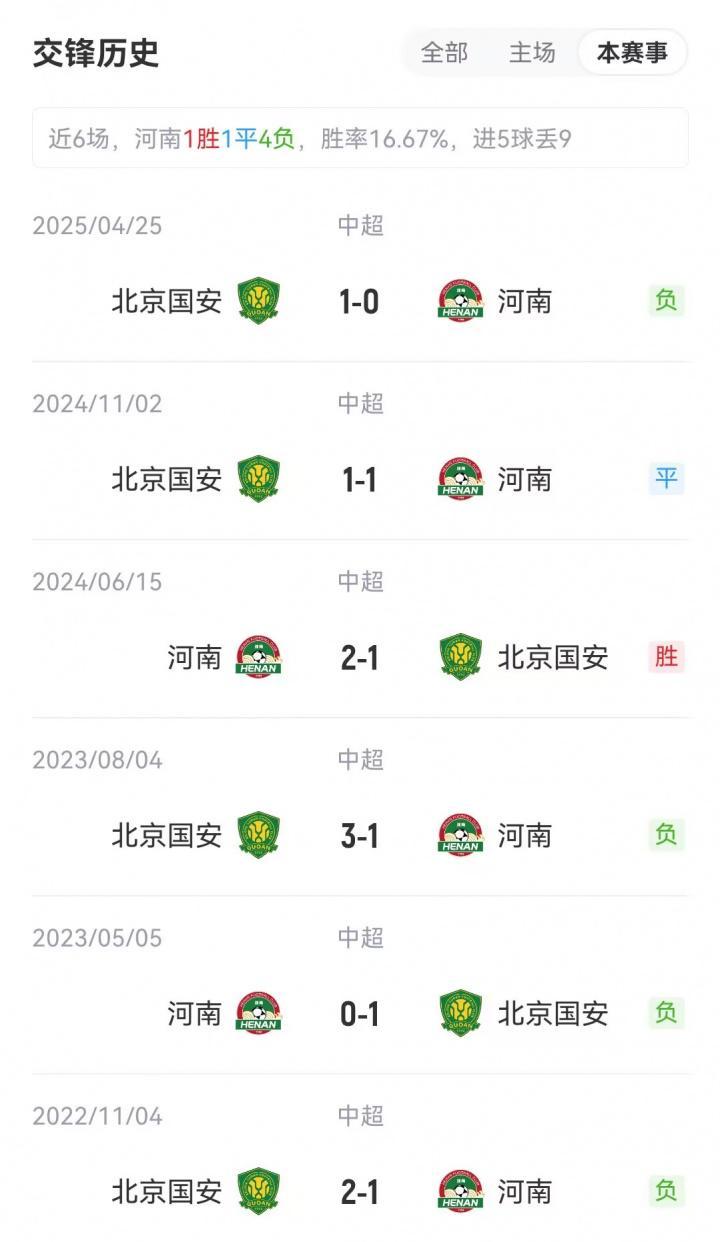 本场比赛将在郑州航海体育场进行。赛前国安14胜6平3负,积48分排名中超第4;河南队6胜5平12负,积23分排名中超第12。本赛季双方上次交手,河南客场0-1不敌国安。