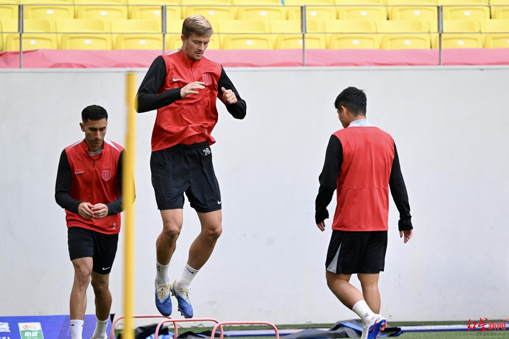 ▲成都蓉城队员正在进行赛前踩场训练